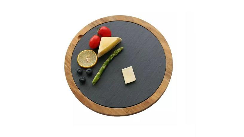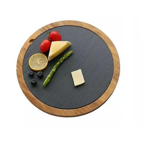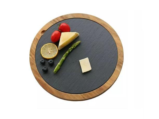 Блюдо для подачи круглое d=30 см. h=1,5 см. черное, сланец, на деревянной подставке MGprof /1/12/ АКЦИЯ