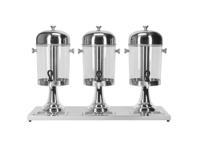 Диспенсер для соков и холодных напитков с тремя емкостями по 8 л каждая. Высота 56 см, общая длина 85 см. Колбы из пищевого полиэтилена, основание, крышки, поддон и контейнер для льда из нержавеющей стали. Оснащен качественными кранами с уплотнителями и поддонами для сбора капель. Идеальное решение для кафе, ресторанов и мероприятий — удобно, гигиенично и стильно.