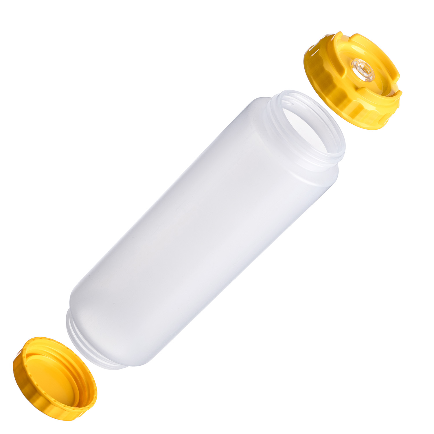 Емкость для соуса 1000 мл. d=75 мм. h=257 мм. c 2 крышками, с силик. носик. широкая прозрачная, крышки желтые GP /1/96/