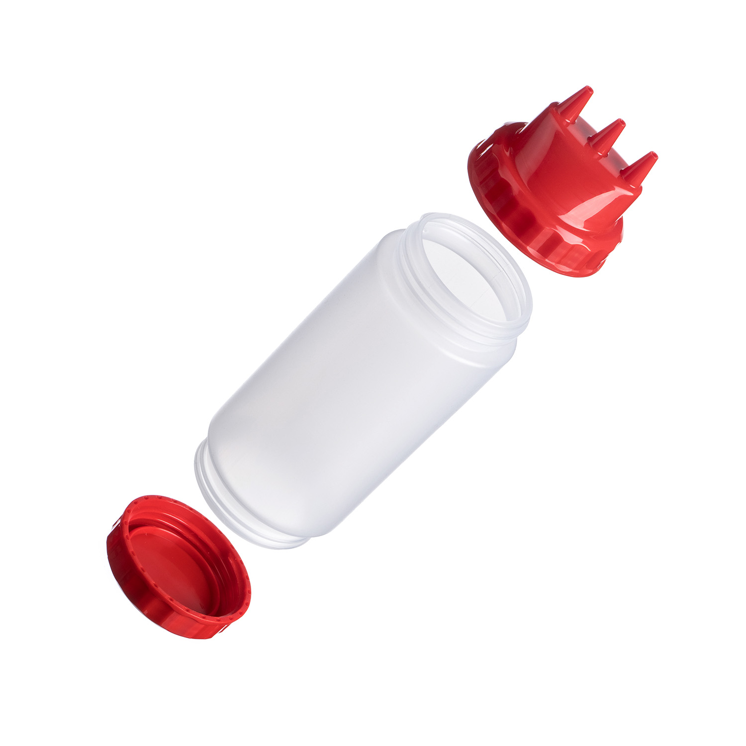 Емкость для соуса 500 мл. d=70 мм. h=200 мм. с 2 крышками 3 носика прозрачная, крышки красные GP /1/96/