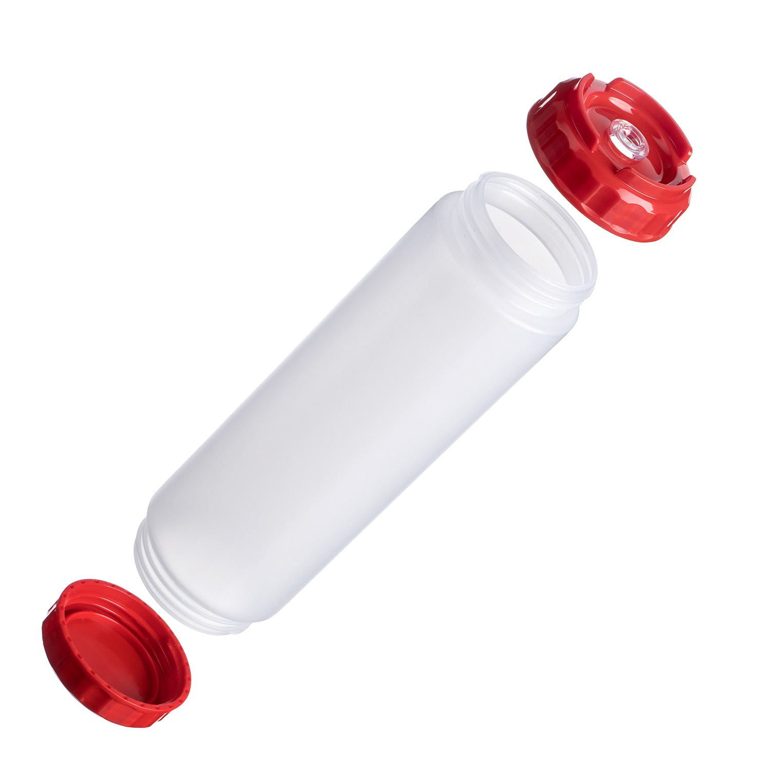 Емкость для соуса 750 мл. d=70 мм. h=237 мм. с 2 крышками, с силик. носик. широкая прозрачная, крышки красные GP /1/96/