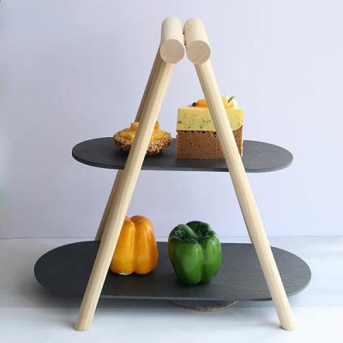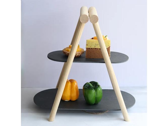 Этажерка 2-х ярусная 31*13,5/41*18,5 см. h=37 см. овальная с дерев. ножкой черная, сланец MGprof /1/5/ АКЦИЯ