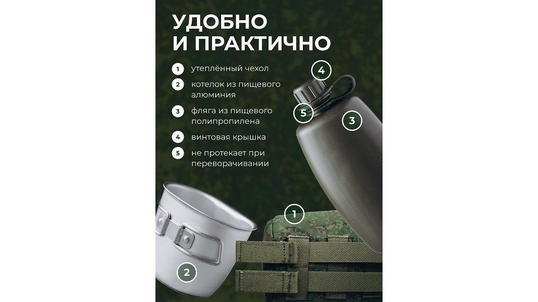 string(378) "101,3*64,9*213 (фляга 750мл) 109,5*75,4*83,1 (котелок 350мл), вес 170гр, с чехлом 273гр. Фляга предназначена для содержания питьевой воды, котелок для приготовления кипятка. Материал: фляга полиэтилен, котелок: пищевой алюминий.