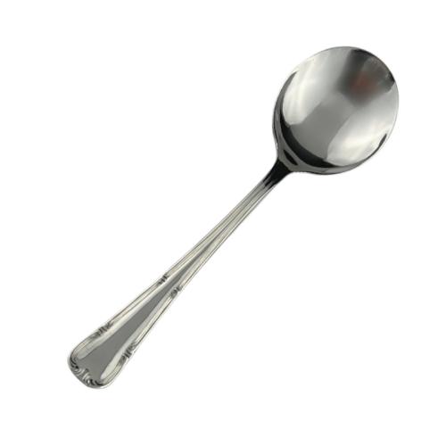 Ложка для бульона Abert Henry VIII – профессиональный столовый прибор, оформленный в классическом стиле с элегантным узором, проходящим по кромке ручки.