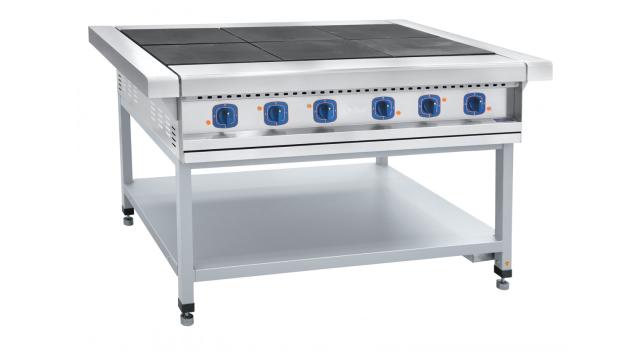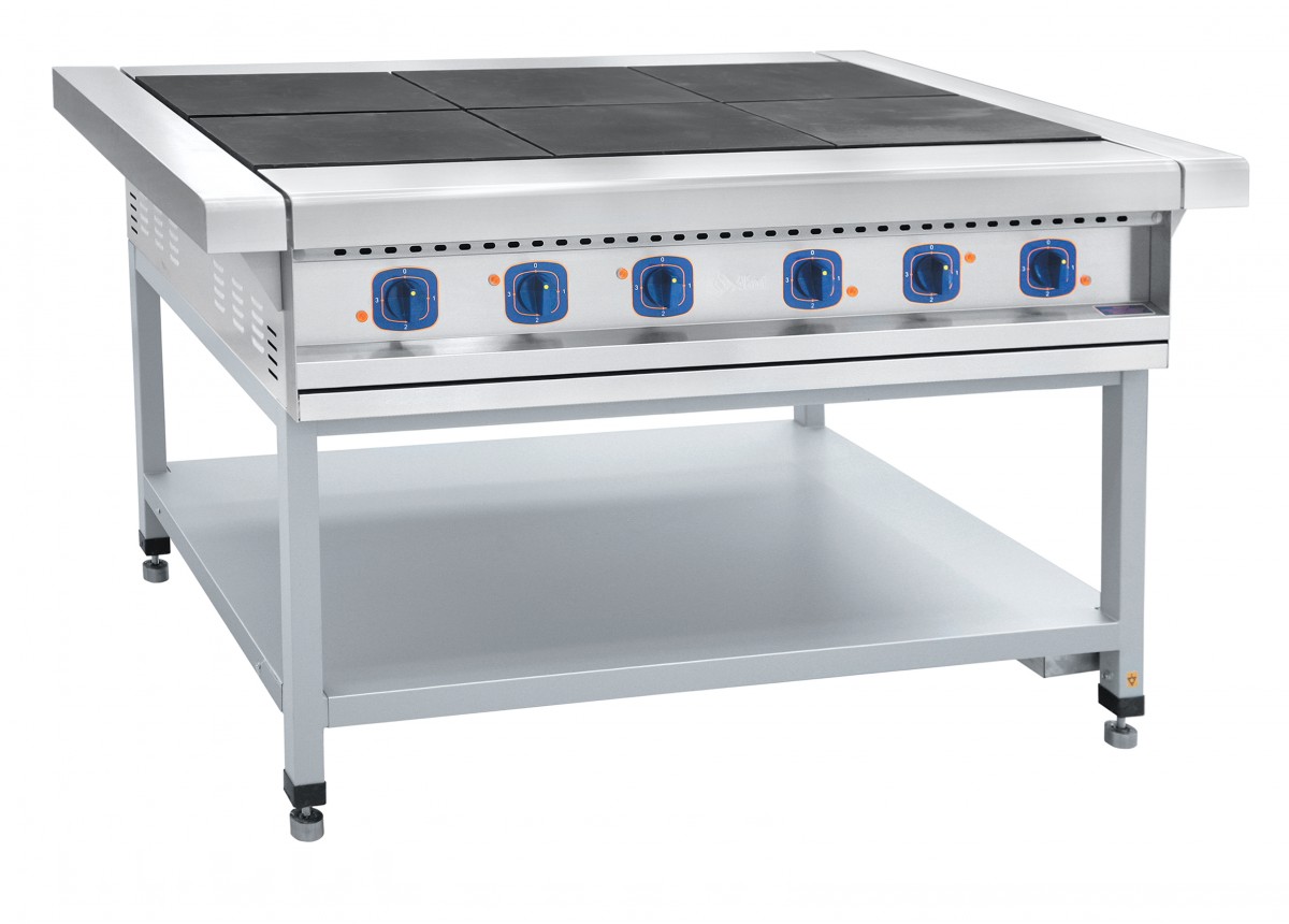 Плита электрическая 6-ти конфорочная на подставке ЭП-6П без жарочного шкафа используется для приготовления всевозможных продуктов питания (первых, вторых, третьих блюд) в наплитной посуде.