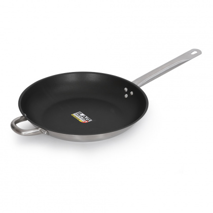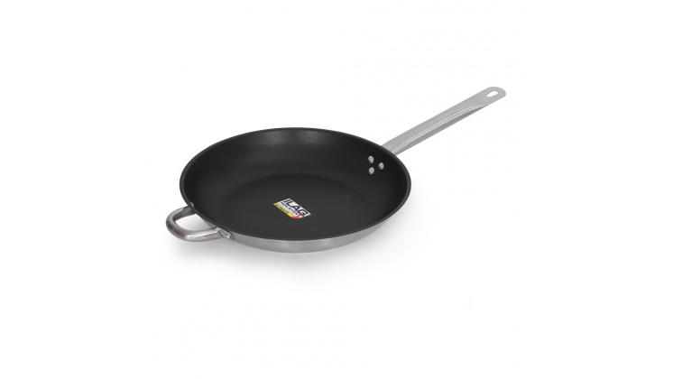 Сковорода из нержавеющей стали с толстым дном и тефлоновым покрытием используется для тушения, обжарки и томления ингредиентов.