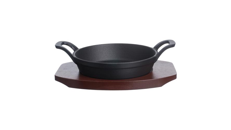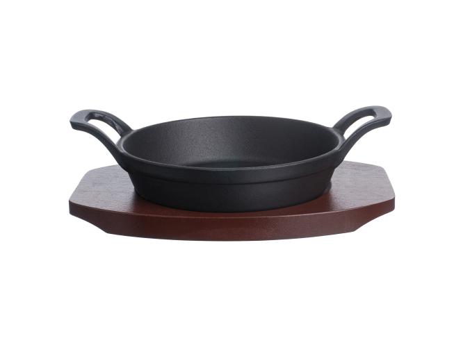 Сковорода порц. d=16 см. h=4,7 см. 0,5 л. чугун. с 2 ручками на дерев. подставке /1/