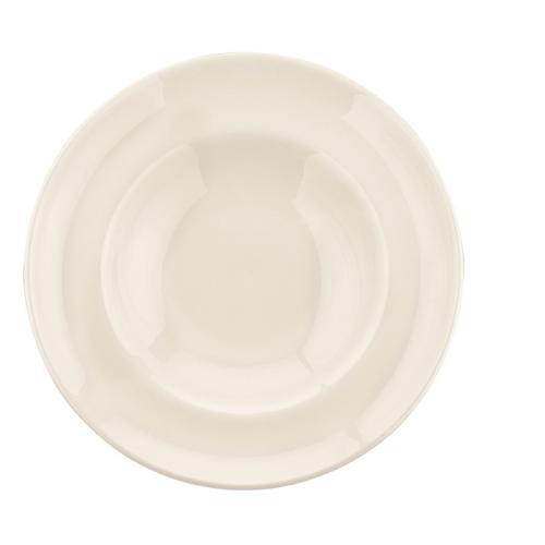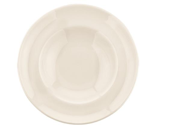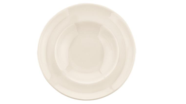 Тарелка белого цвета со сливочным оттенком.