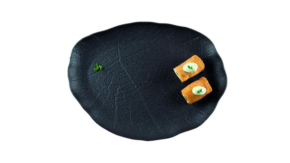 Блюдо для подачи насыщенного черного цвета со стилизацией поверхности под рисунок листьев лотоса.