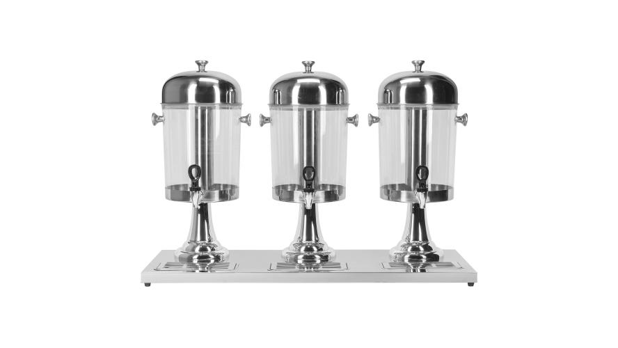 Диспенсер для соков и холодных напитков с тремя емкостями по 8 л каждая. Высота 56 см, общая длина 85 см. Колбы из пищевого полиэтилена, основание, крышки, поддон и контейнер для льда из нержавеющей стали. Оснащен качественными кранами с уплотнителями и поддонами для сбора капель. Идеальное решение для кафе, ресторанов и мероприятий — удобно, гигиенично и стильно.