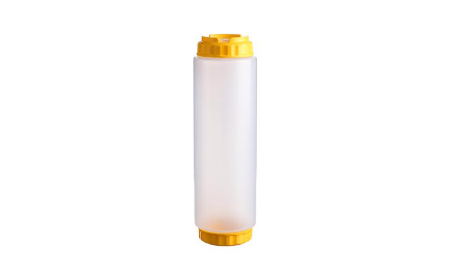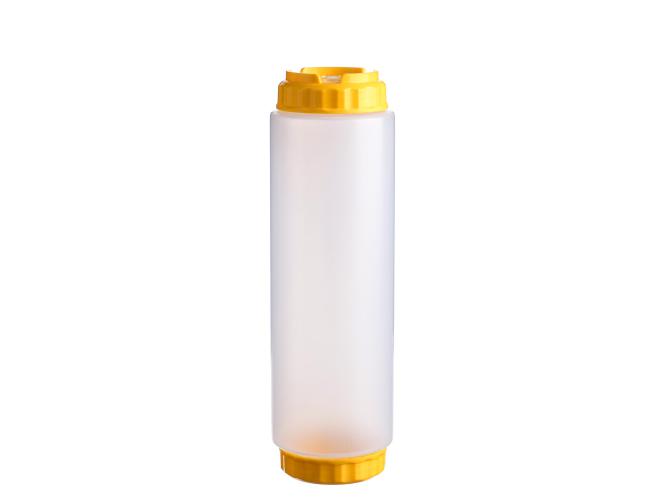 Емкость для соуса 1000 мл. d=75 мм. h=257 мм. c 2 крышками, с силик. носик. широкая прозрачная, крышки желтые GP /1/96/