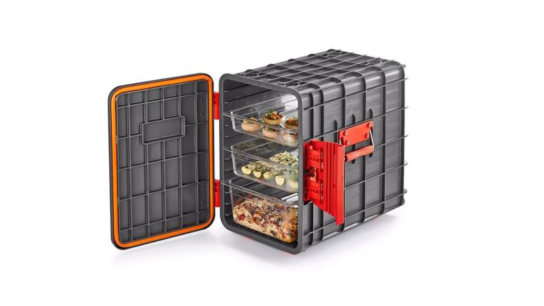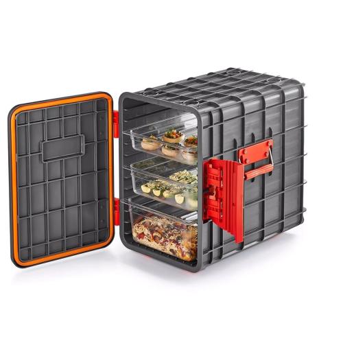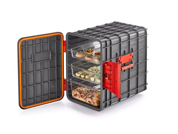 Легкий и прочный, термоконтейнер имеет фронтальную загрузку и полностью съемную переднюю крышку, что значительно упрощает доступ к содержимому. Удобные ручки из полиамида, усиленные волокнами, обеспечивают надежный захват и комфорт при переноске.