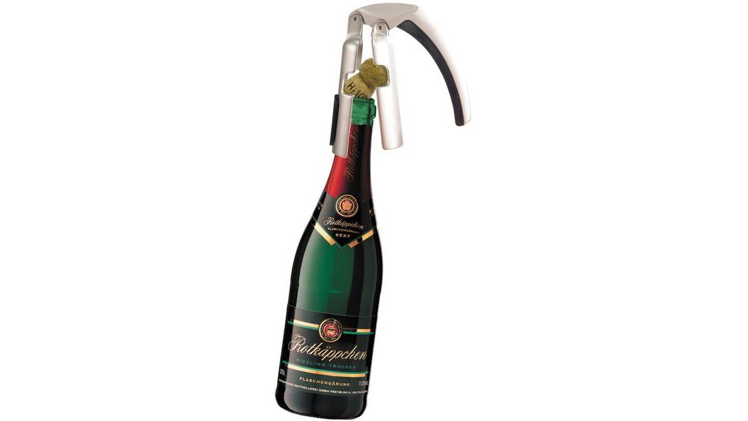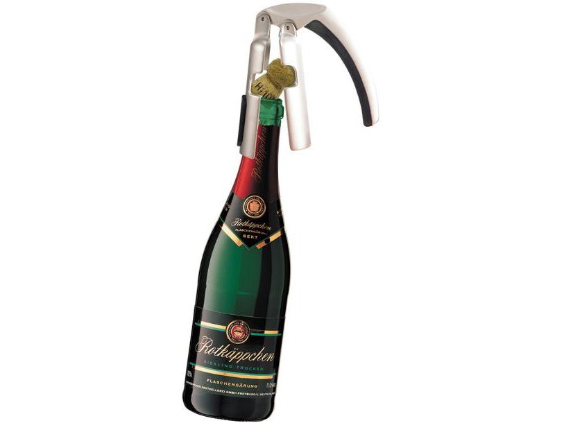 Пробка фиксируется в специальном отверстии между двумя концами и одним движением извлекается из горлышка.