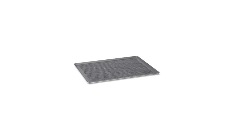 Микроперфорированный прямоугольный противень со скошенными краями, изготовленный из алюминия с покрытием.