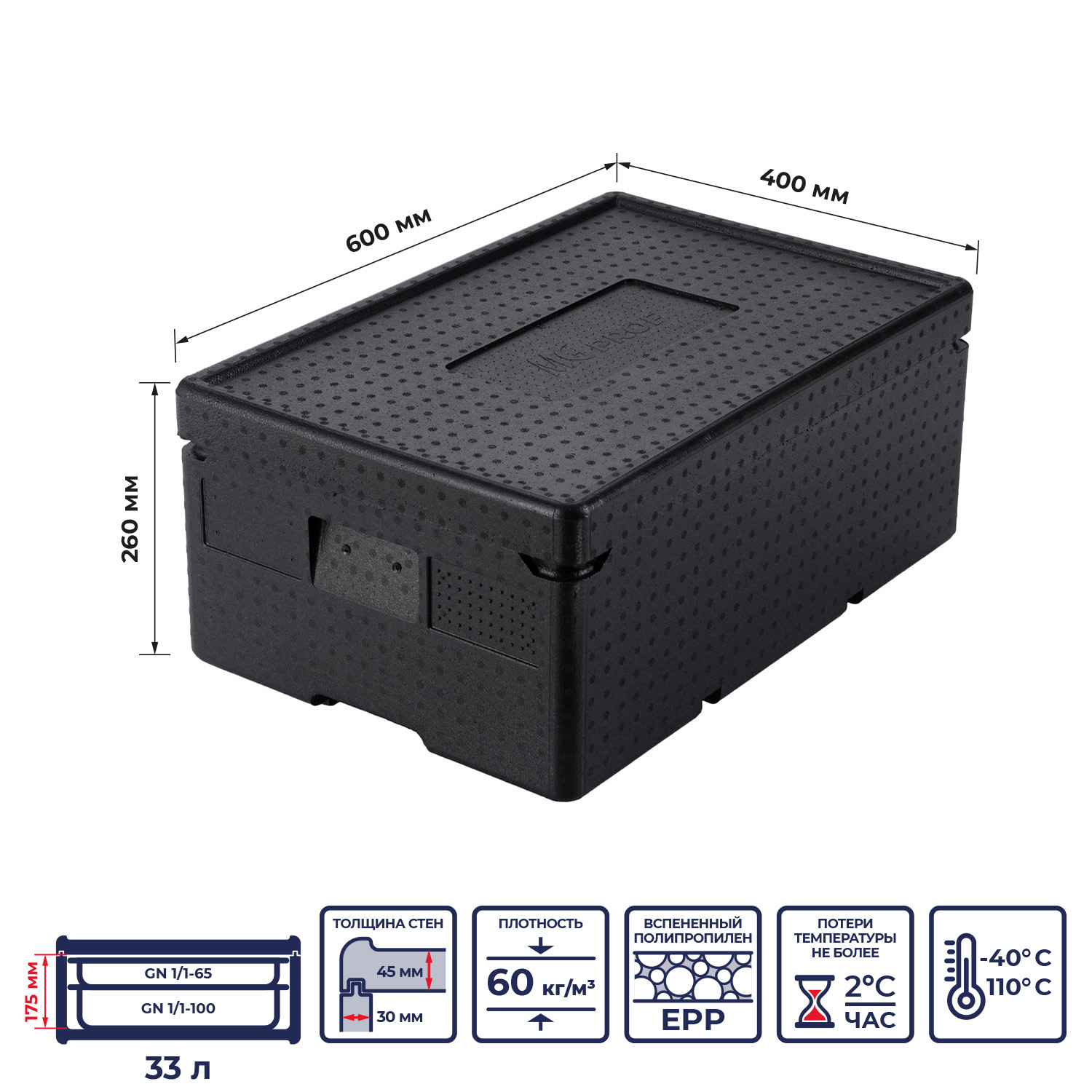 string(1814) "Термоконтейнер MGprof объемом 33 литра — идеальное решение для хранения и транспортировки продуктов в гастроемкостях 1/1, 1/2, 1/3 различной высоты, а также в порционных упаковках. Размеры контейнера 600*400*265 мм, внутренние габариты 540*360*175 мм. обеспечивают удобство и универсальность использования. Изготовлен из прочного и легкого вспененного полипропилена с плотностью 60 кг/м³, что гарантирует надежность и долговечность термоконтейнера.